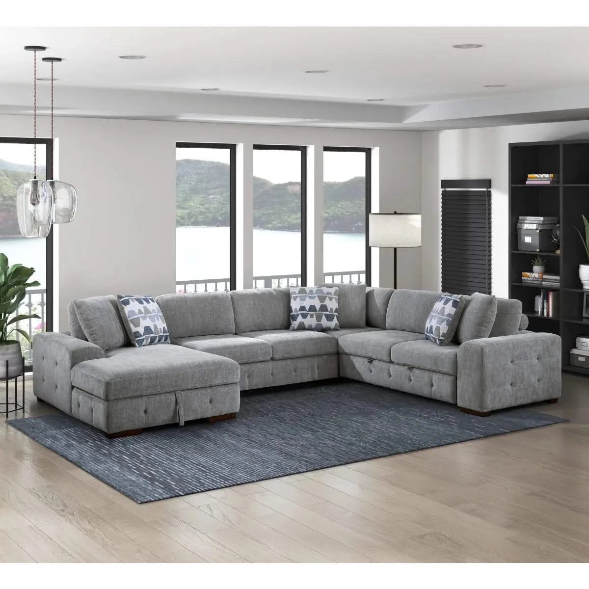 Evolution Gray Modern 4 PC Sectional with Pull-Out Bed, Storage Chaise and Throw Accent pillows