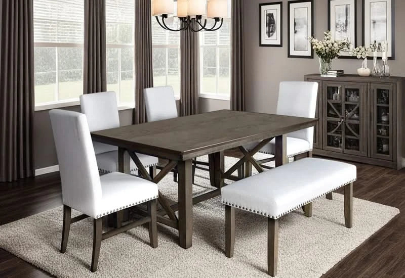 Kiara Brown Rustic Farmhouse 6PC Dining Set with 66” Wooden Table, 4 Fabric Chairs and 1 Fabric Bench