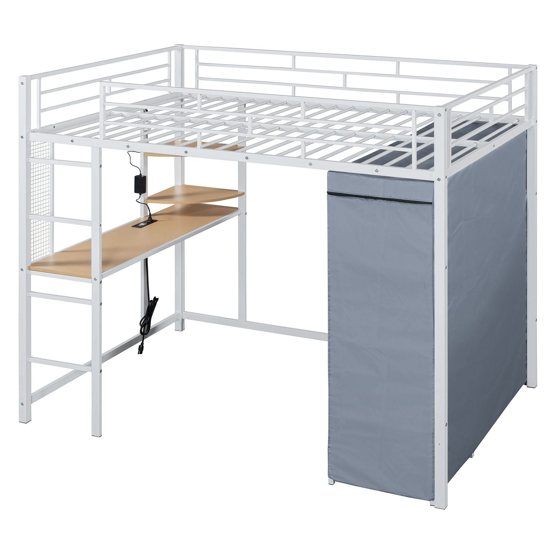 Loft Bed With Desk, Shelves, Power Outlet, LED Light And Wardrobe