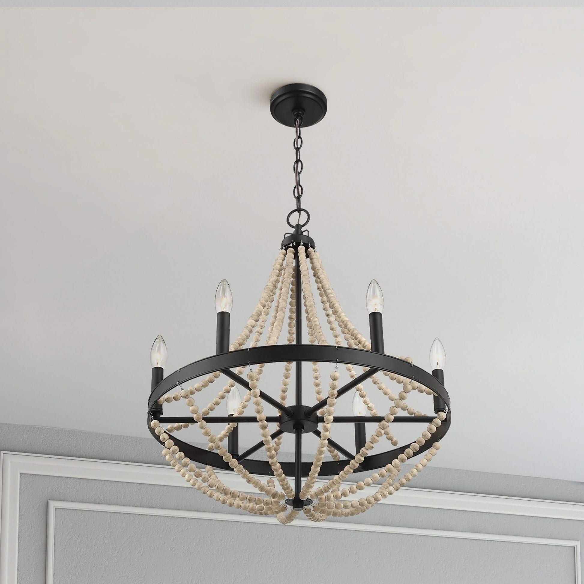 Starry - Chandelier 6 Candle Light Wood Beaded Pendant Light For Dining Room - Black / Clear